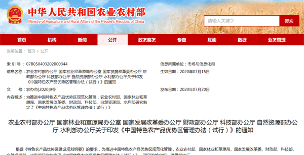 根据《特色农产品优势区建设规划纲要》的要求,为推进中国特色农产品优势区规范化管理,农业农村部、国家林业和草原局、国家发展改革委、财政部、科技部、自然资源部、水利部研究制定了《中国特色农产品优势区管理办法(试行)》,现印发给你们,请贯彻执行。