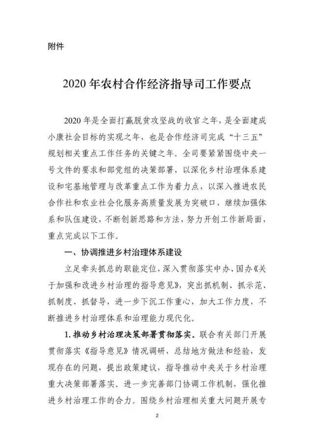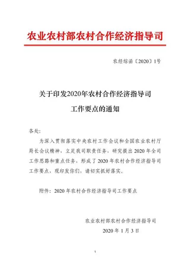 农业农村部:2020年农村合作经济指导司工作要点