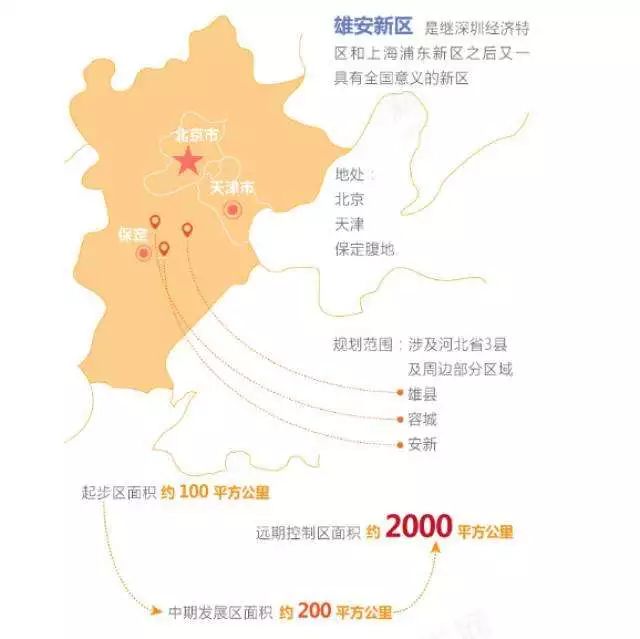 雄安新区规划建设以特定区域为起步区先行开发,起步区面积约100平方公里,中期发展区面积约200平方公里,远期控制区面积约2000平方公里。