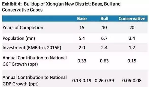 大摩称,在乐观的预估下,中国政府可能将在十年内完成非首都职能的人口搬迁(452万人),而雄安新区的内部人口增速则会达到3%。这种情况下,对雄安的总投资规模将达到2.4万亿人民币,意味着每年提振国内投资增速0.6%,提振GDP增速0.26-0.39%。