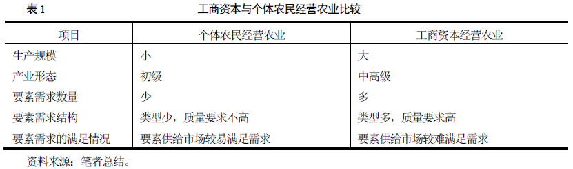 表1总结了工商资本经营农业与个体农民经营农业的区别。个体农民的农业生产投入规模小,产业形态较为初级,要素投入以传统要素为主,并且传统要素几乎能替代现代要素;而工商资本经营农业的产业形态更加高级,产业融合更加深入,产业链条更长,要素投入结构发生了重大变化。单就土地要素而言,过去工商资本下乡主要是企业资本要素与农村耕地资源组合生产,如今土地要素的类型已从耕地向设施农业用地、建设用地拓展。工商资本需求的要素类型已从单一类型向多种类型转变,要素间的替代性缩小。然而,面向工商资本企业的多类型、高质量的要素供给恰恰是农村要素市场的短板。
