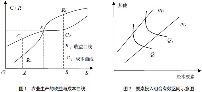 从要素数量看,农村要素市场不一定能满足工商资本企业密集型的要素需求。工商资本企业务农往往会在厂房、农业机械等方面投资较大,为了能够覆盖高昂的初始投入成本,工商资本下乡后企业不得不选择较大的生产规模。如果反映在图1中,生产规模就必须跨越盈亏平衡点E点。当用资本要素衡量生产规模时,反映在图2中,生产规模要达到等产量线Q2的规模。受要素边际技术递减规律影响,任何一种产品的生产技术都要求各要素投入之间有适当的比例,反映在图2中,即资本要素不能完全替代其他要素,等产量曲线的要素有效投入组合区间位于线m1与m2之间。因此,当资本要素投入较大时,与资本要素组合生产的其他关键配套要素(如设施农业用地或技术)也存在密集型的特征,而这些要素往往是农村较为稀缺的。