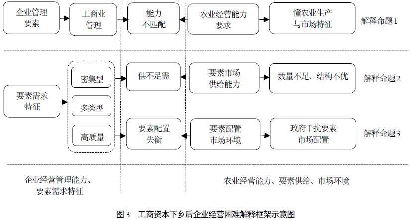 综合命题1~3,本文构建了如图3所示的解释分析框架。需要说明的是,工商资本下乡后企业经营困难可能是上文提到的某项因素导致的,也可能是多项因素共同导致的。