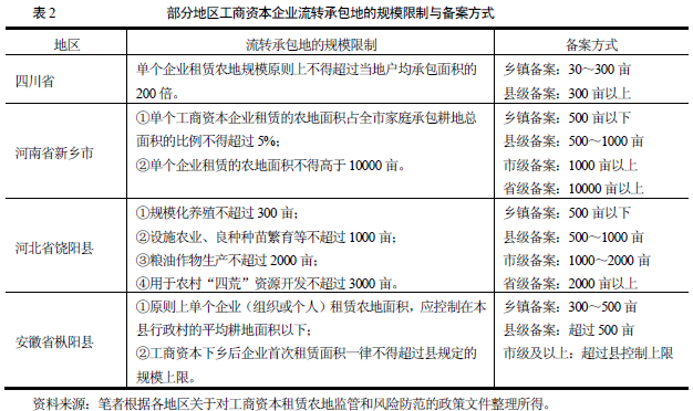 三是政府干扰企业要素配置数量。许多地方对工商资本下乡后企业租赁的土地面积做了限制,并规定了备案方式(见表2),例如,河北省饶阳县规定,在规模化养殖、设施农业、粮油作物生产领域,企业租赁的土地面积分别不能超过300亩、1000亩、2000亩,这导致当地许多工商资本企业因生产规模不足而亏损。