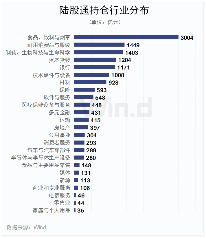 在Wind二级行业中,食品、饮料与烟草行业持仓市值超过3000亿元,占比20%,此外,耐用消费品与服装、制药、生物科技与生命科学、资本货物、银行、技术硬件与设备6大行业持仓市值均超过千亿。