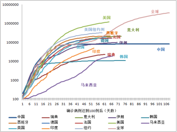 图1 100例后主要国家累计确诊病例变化(5月5日)