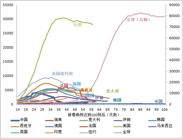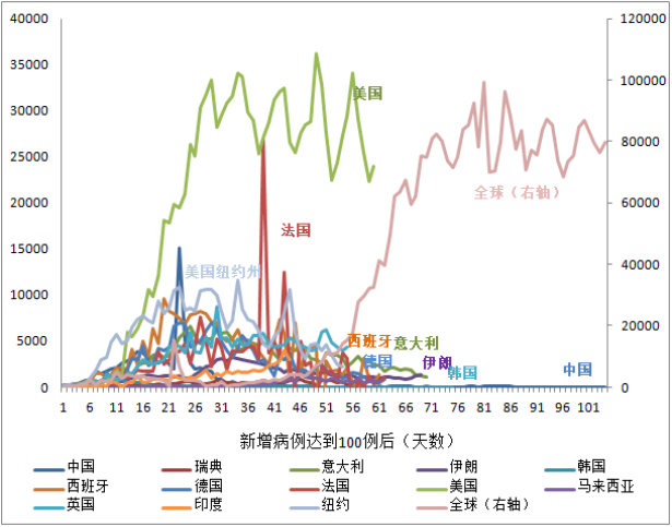 图2 100例后主要疫情国家新增确诊病例增长(5月5日)