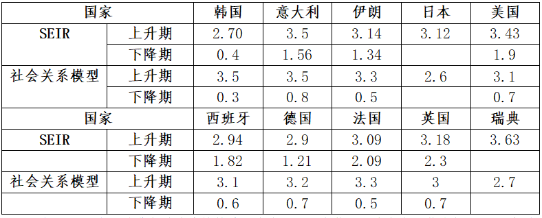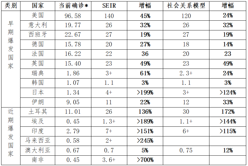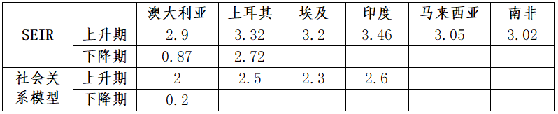 注:1)马来西亚、埃及、印度、南非尚处于疫情快速爆发期,SEIR模型未估计下降期的事实传染数。2)马来西亚与南非两国确诊病例数存在明显拐点,因此未进行社会关系模型拟合;社会关系模型并未估计土耳其下降期的事实传染数。3)两个模型对与上升期与下降期估计事实传染数的时间窗口存在差别。