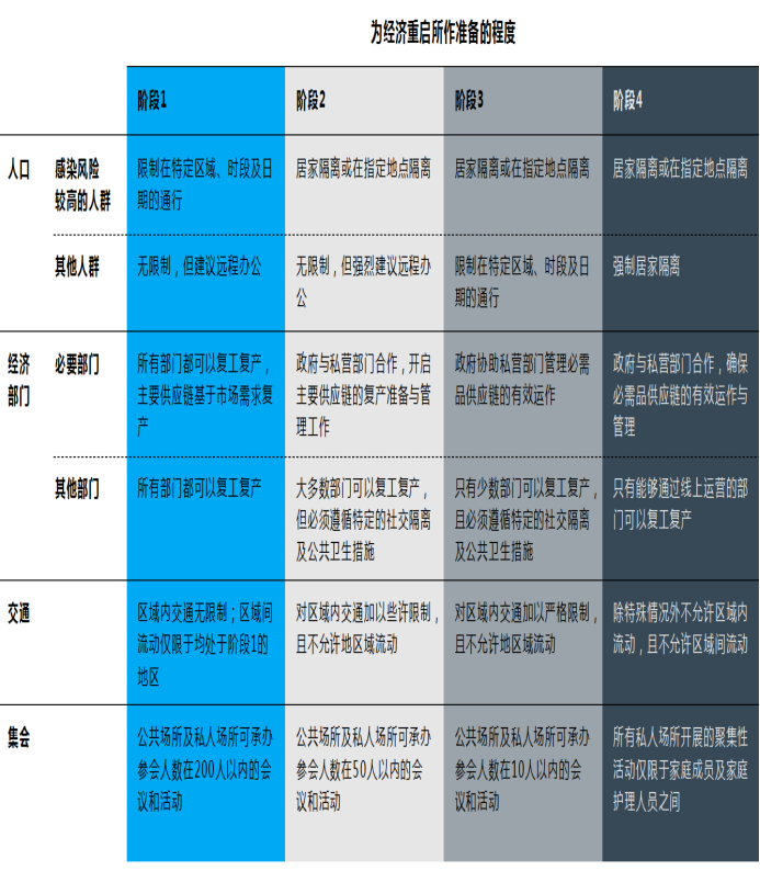 参考各国政府和多个智库关于退出封锁和重启经济的指南和报告,大致基本思路为:放宽社会与经济限制与持续有效的卫生防护相结合,让一些年龄段、地区、社会和商业职能部门可以优先恢复活动。