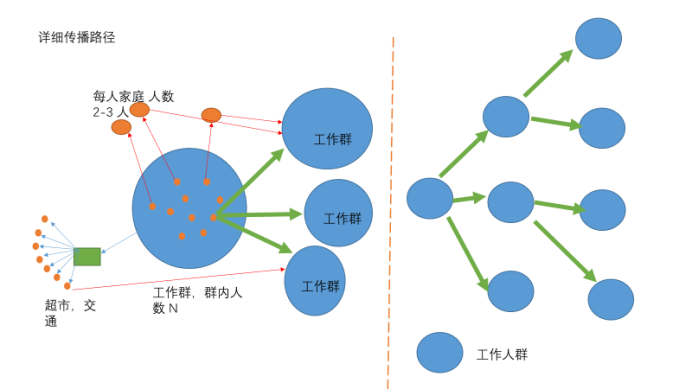 为了解决SEIR模型无法捕捉人员流动减少、之后复工影响以及外来疫情输入等实际情况对疫情的影响。第一财经研究院自主研发了“基于社会关系网络的病毒传播模型”,模型从微观结构入手,通过分析病毒扩散的拓扑结构,建立了工作、家庭与公共场所三个场景,以此刻画病毒的传播。