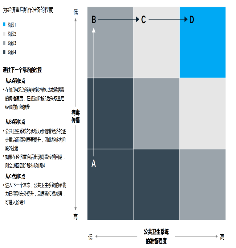 在经济学家看来,选择是否重启、何时重启、如何重启经济和社会运行,其实是对两个变量的权衡:一个是医疗资源可以收治和处理的“公共卫生约束”;另一个则是经济和个人能够容忍的由封锁导致的经济损失和个人生活和精神的“经济社会容忍”,两个变量的均衡决定了重启的速度、节奏和具体措施。如同麦肯锡给出的路线图所表明的那样,重启将是一个渐进、甚至可能反复的阶段性过程。在疫情可能有秋冬季节“第二波”的更糟情形下,和病毒共存可能将持续全年、甚至更久,直到有效疫苗大规模使用,或者民众获得所谓“群体免疫”。
