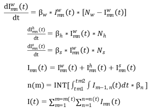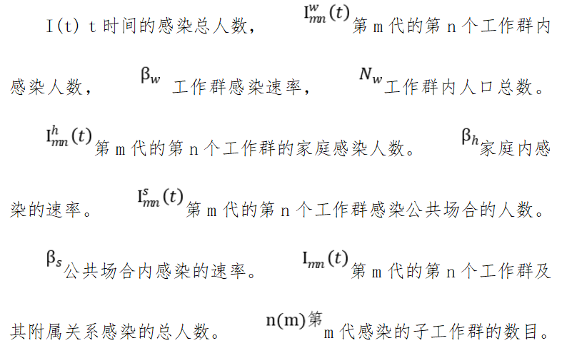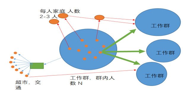 工作群是病毒传染的第一个场景。在工作场所内,每个潜伏期患者都能够按相同的传播速率传播给周围的人,当出现多个患者时,传播速率线性叠加,大大增加工作人群内的被传染的概率,我们将工作群传播数据作为基准传播速率(概率)。特别指出的是,在一些地区,单个工作群随着管控力度加强会向下修正。