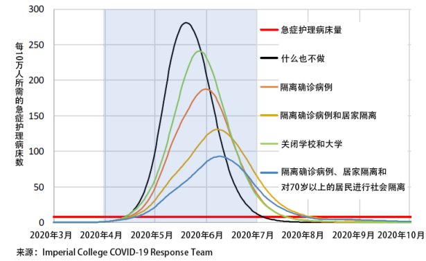 图3 非医疗手段干预将减少新冠疫情对于医疗资源的需求(以英国为例)