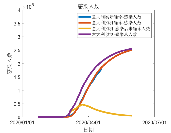 “封锁”近1个半月后,意大利的疫情已经趋于缓和。截至4月25日,意大利确诊病例为195351例,确诊死亡率13.5%。两个模型的预测结果都显示,意大利的确诊人数高峰为26万人,预计高峰时间将在6月初(社会关系模型)或6月中(SEIR)。