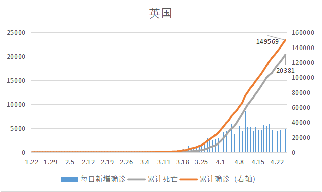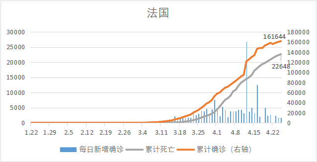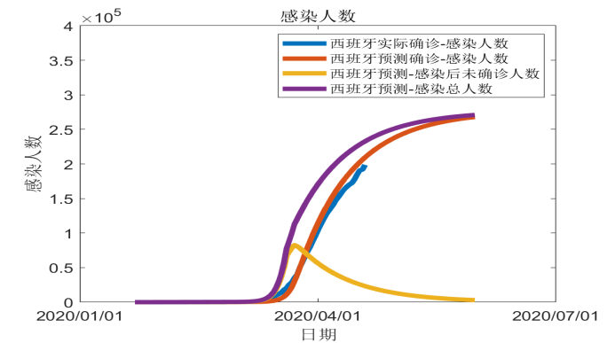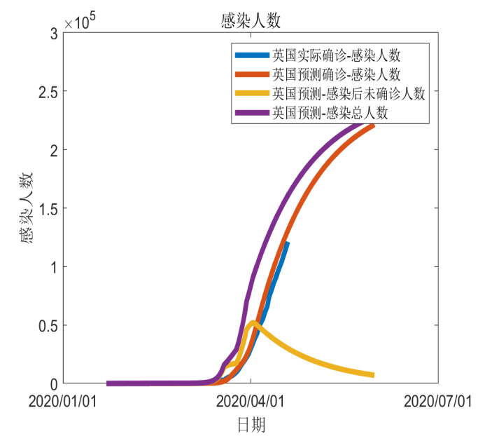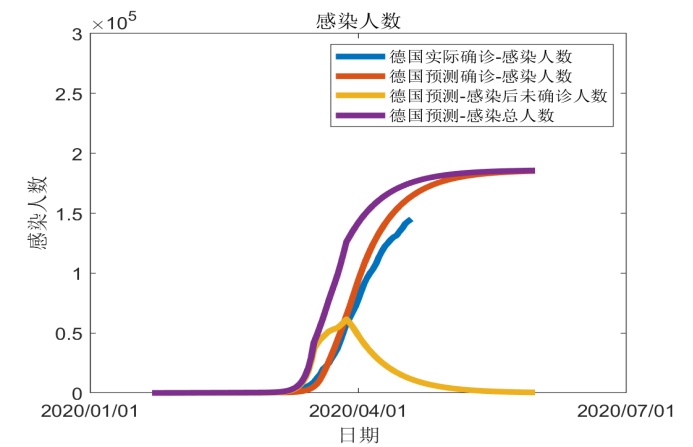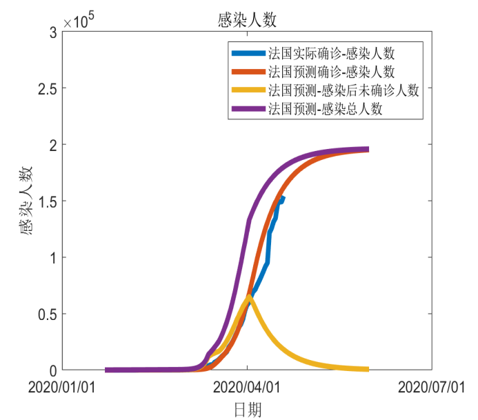 截至4月25日,法国确诊病例为161644例。社会关系模型显示,法国确诊病例将在5月底达到峰值,约为20万确诊病例;SEIR模型显示,确诊病例高峰将在6月初出现,累计确诊病例为22万人。
