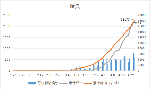 截至4月25日,瑞典确诊病例为18177例。由于未执行严格的“封锁”措施,目前仍难以预测瑞典确诊人数高峰出现的时间。模型显示,5月底瑞典累计确诊人数将至少为2.3万人(社会关系模型)或3万人(SEIR)。