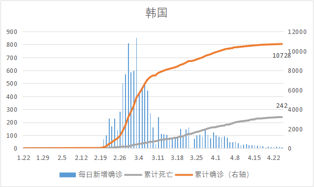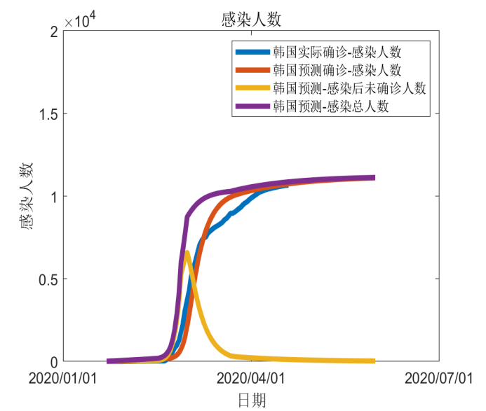 韩国是国际上最早出现疫情爆发的国家,但也是主要疫情国中最早出现新增确诊人数大幅下降的国家。截至4月25日,韩国确诊病例为10728例。两个模型显示,韩国确诊人数高峰将在4月底(社会关系模型)或5月初(SEIR)出现,两个模型预测的累计确诊人数均为1.1万人。