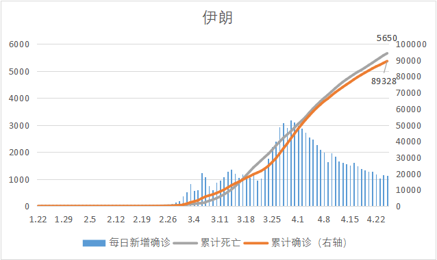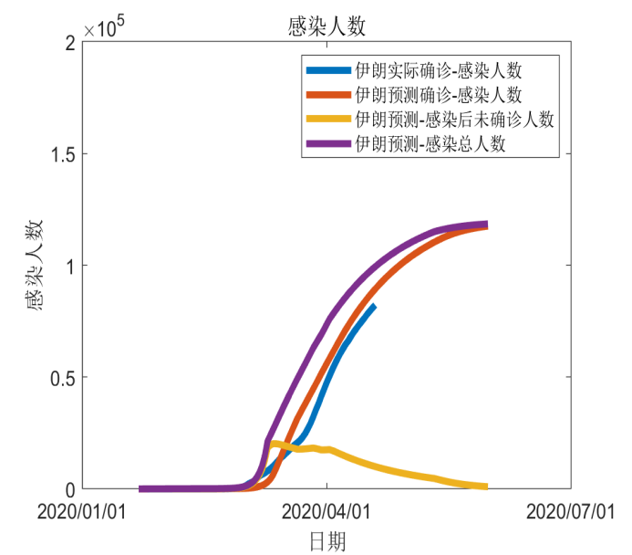 4月开始伊朗的疫情明显缓和。截至4月25日,伊朗确诊病例为89328例,确诊死亡率为6.3%。两个模型显示,伊朗确诊人数高峰将在5月底(SEIR)或6月初(社会关系模型)出现,累计确诊人数将为11万人(SEIR)或12万人(社会关系模型)。
