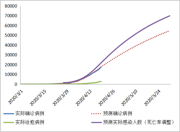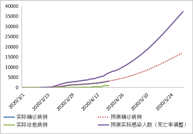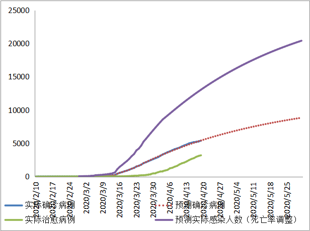 截至4月25日,马来西亚确诊病例为5742例。由于仍然处于疫情爆发早期,目前判断马来西亚确诊病例高峰仍然困难。SEIR显示,到5月底马来西亚确诊人数将超过9000人。我们根据死亡率对该国数据进行了调整,结果显示5月底马来西亚实际感染人数会超过20000例。