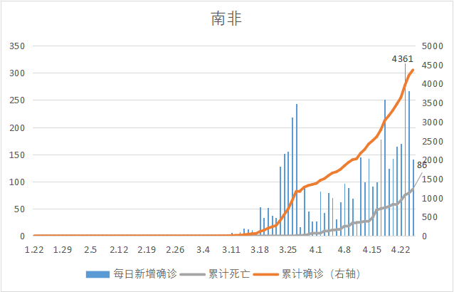 截至4月25日,南非确诊病例为4361例。整个非洲受困于检测能力不足限制,而且南非目前仍处于疫情爆发早期,因此判断确诊病例高峰仍然困难。SEIR显示,到5月底南非确诊人数将超过1.7万例,我们根据死亡率对该国数据进行了调整,结果显示南非实际感染人数在5月底会超过3.6万例。