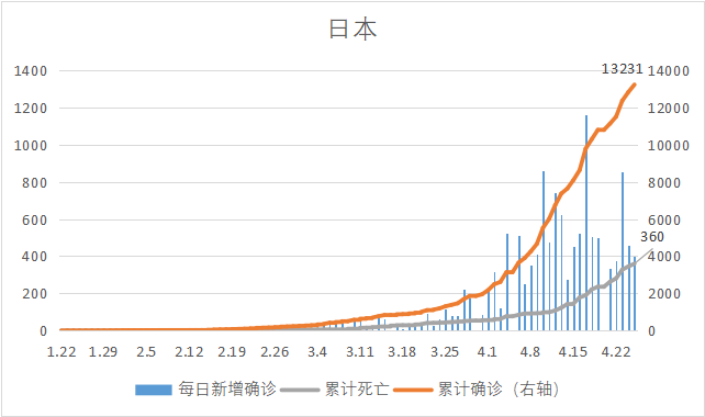 日本新增确诊病例仍处于快速增长期。截至4月25日,日本确诊病例数为13231例。由于没有采取大规模的封锁措施,判断日本疫情高峰仍然困难。两个模型利用现有事实感染数预测了疫情的发展,社会关系模型显示,到6月累计确诊病例将超过3万例;SEIR模型显示日本累计确诊病例在5月底就将超过4万例。