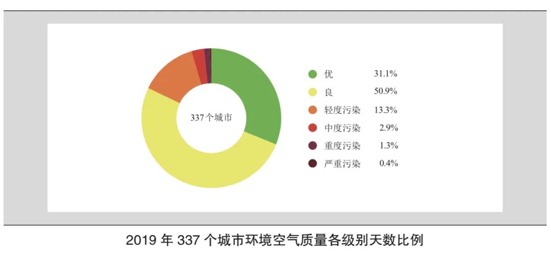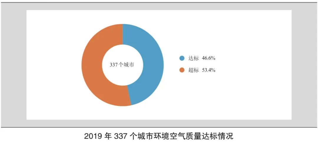 2019年,全国环境空气质量改善成果进一步巩固。在全国337个地级及以上城市中,环境空气质量达标的城市占全部城市数的46.6%。