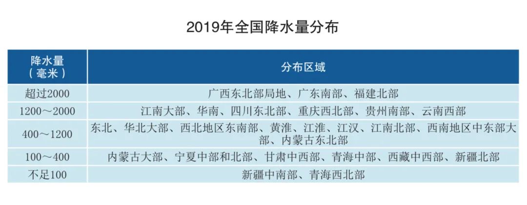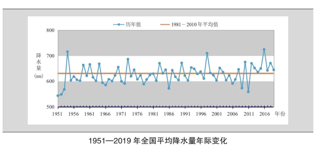 2019年,全国平均降水量645.5毫米,较常年偏多2.5%,为2012年以来连续第8个多雨年。