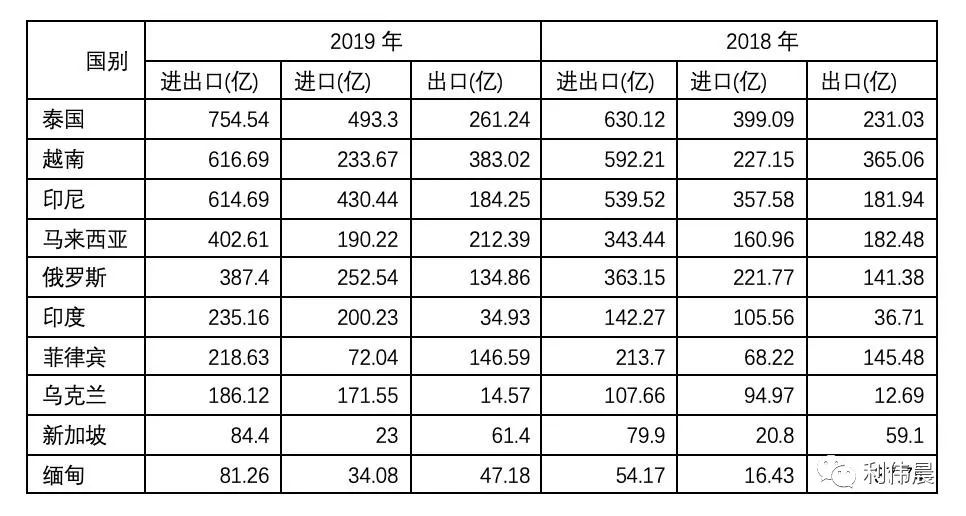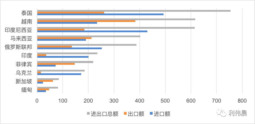 在纳入商务部、国家统计局与国家外汇管理局统计的63个“一带一路”沿线国家中,泰国、越南、印度尼西亚、马来西亚、俄罗斯联邦、印度、菲律宾、乌克兰、新加坡、缅甸是与中国农产品贸易规模最大的10个“一带一路”沿线国家。在位居前三的国家中,根据中国农业农村部的统计,2019年,中国与泰国的农产品贸易规模达754.54亿元,其中中国进口493.3亿元,出口261.24亿元,进出口总额较2018年增长19.7%;与越南农产品贸易规模达616.69亿元,其中中国进口233.67亿元,出口383.02亿元,进出口总额较2018年增长4.1%;与印度尼西亚农产品贸易规模为614.69亿元,其中中国进口430.44亿元,进口184.25亿元,进出口总额较2018年增长13.9%。在前十国家中,中国与印度的农产品贸易增幅最大,较2018年增长65.3%,其次是缅甸,增幅高达50%。