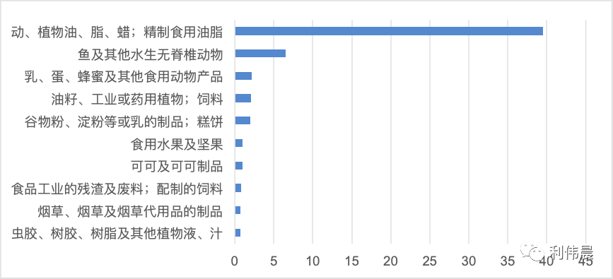 从进口商品品类看,中国从印尼第一大进口商品品类为动、植物油、精制食用油脂及蜡等,进口金额达39.5亿美元;第二大进口产品为水产品,进口金额6.5亿美元;乳蛋及其他食用动物产品进口金额达2.2亿美元。