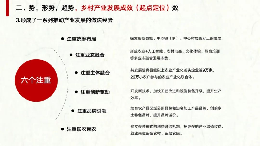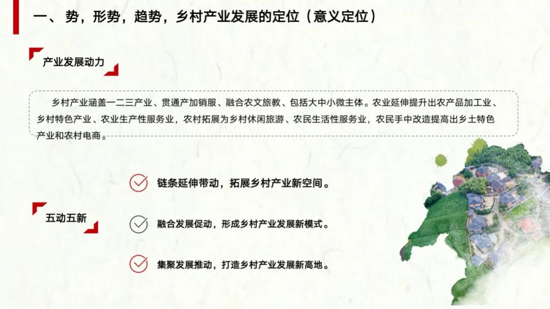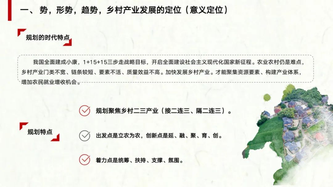 乡村产业根植于县域,以农业农村资源为依托,以农民为主体,以一二三产业融合发展为路径,地域特色鲜明、创新创业活跃、业态类型丰富、利益联结紧密,是提升农业、繁荣农村、致富农民的产业。乡村振兴的大逻辑是产业要振兴。发展乡村产业是乡村全面振兴的重要根基,是巩固提升全面小康成果的重要支撑,是推进农业农村现代化的重要引擎。