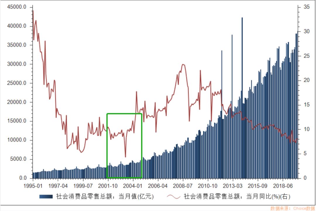 2003年4至6月,社会消费品零售总额同比增速分别为7.7%、4.3%与8.3%;相比之下,2002年4至6月的该指标分别为8.2%、9.3%与8.6%,2003年1至3月的该指标分别为10.0%、8.5%与9.3%。不难看出,非典疫情的爆发的确对消费产生了显著负面影响,尤其是在2003年5月,社会消费品零售总额同比增速比上月下降了3.4个百分点,比2002年同月下降了5.0个百分点。