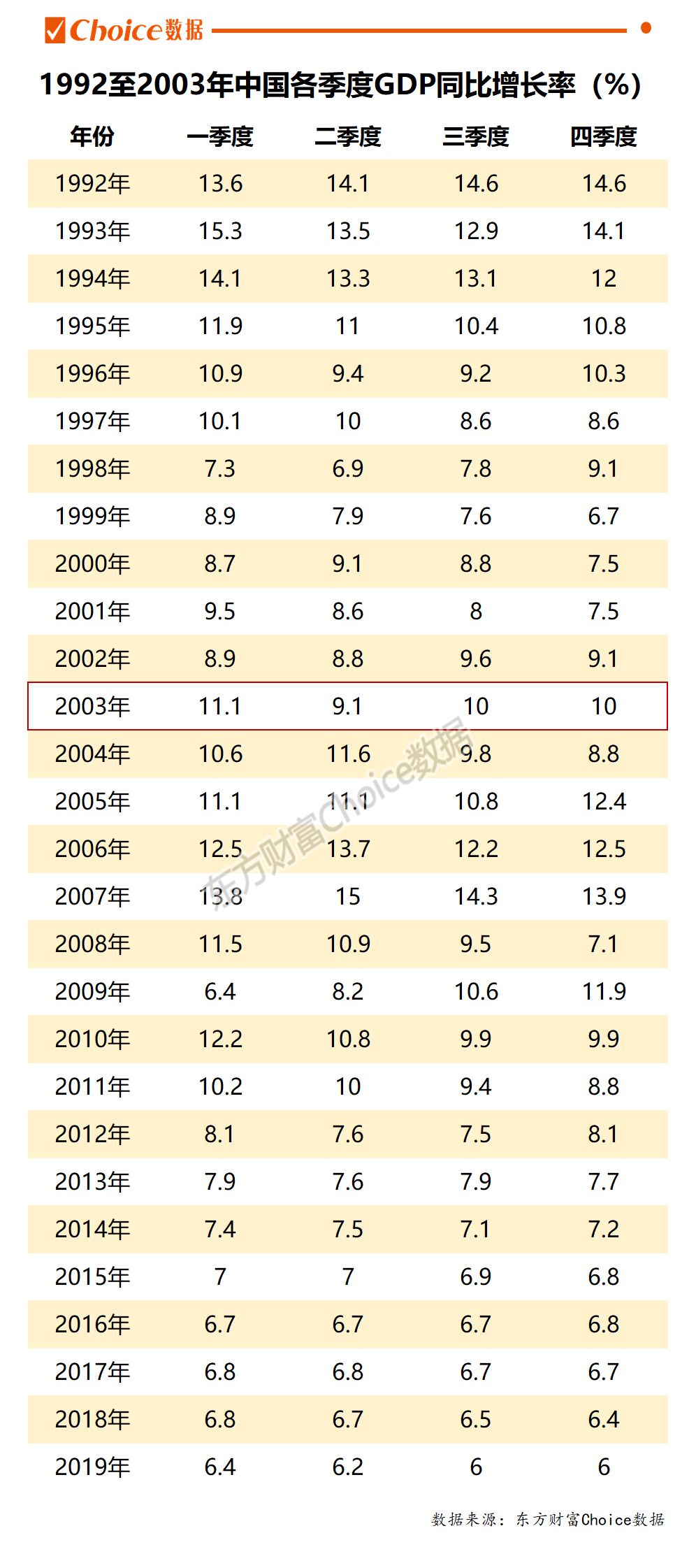 由于当时中国大陆消费对GDP的贡献低于投资,得益于政府的宽松的货币政策带来的投资增长(房地产投资二季度同比增长33%)和应对危机采取定向财政支持,以及中国加入WTO后的全球化红利,2003全年中国大陆实际GDP相对于2002年增长了10%。