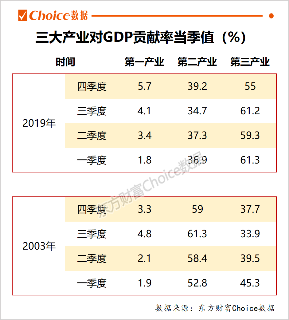 但值得注意的是,在当前,无论是第三产业占GDP比重还是最终消费占GDP比重,都显著高于2003年。2019年,第三产业在我国GDP中的贡献率超50%,成为在GDP中所占比重最高的部门。