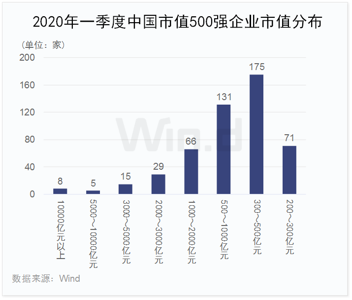大部分企业市值位于300-1000亿元之间,300-500亿元之间的企业最多,有175家。