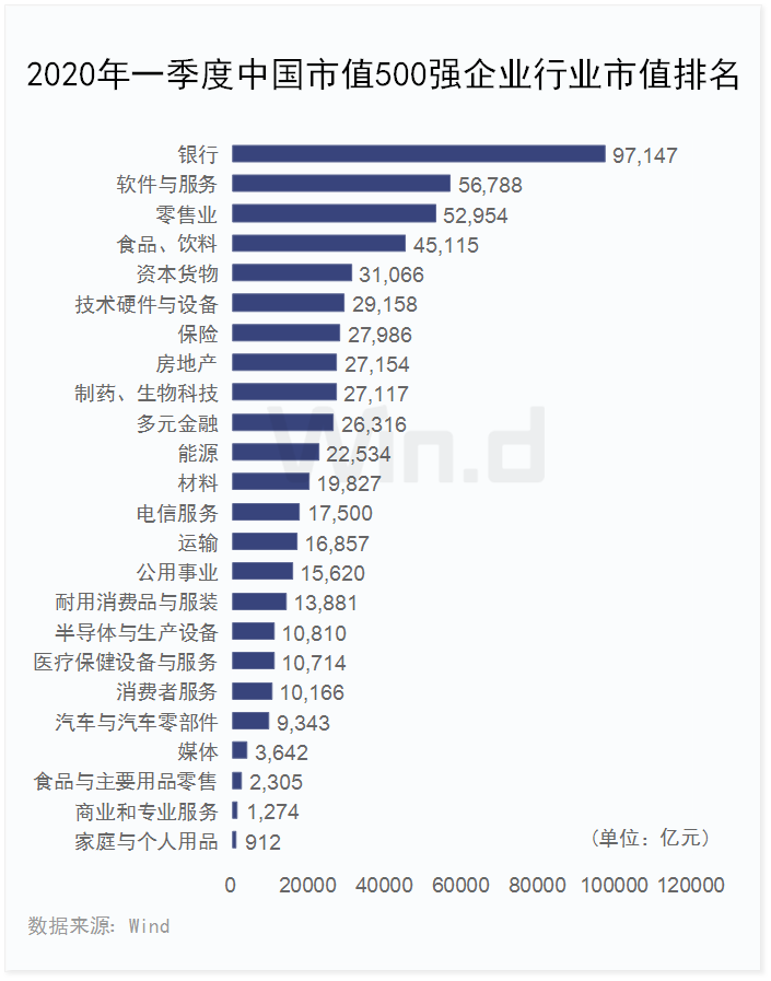 银行业总市值最高,超过9万亿元,软件与服务和零售业紧随其后。