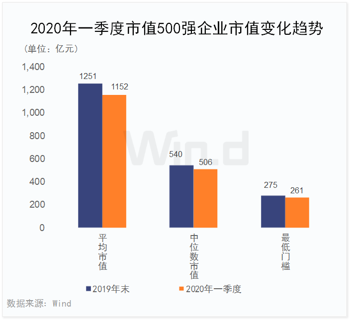 由于一季度市场整体下跌,500强企业平均市值、中位数市值、最低门槛,均有不同程度下降。