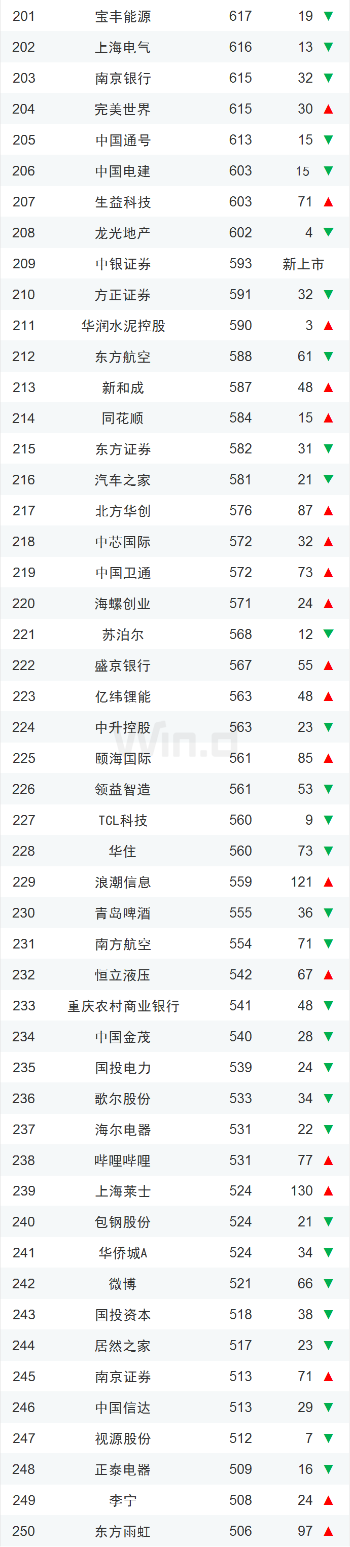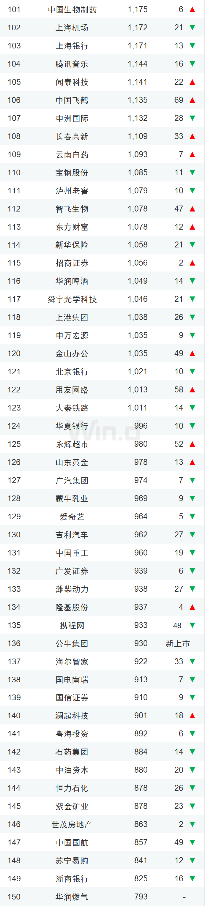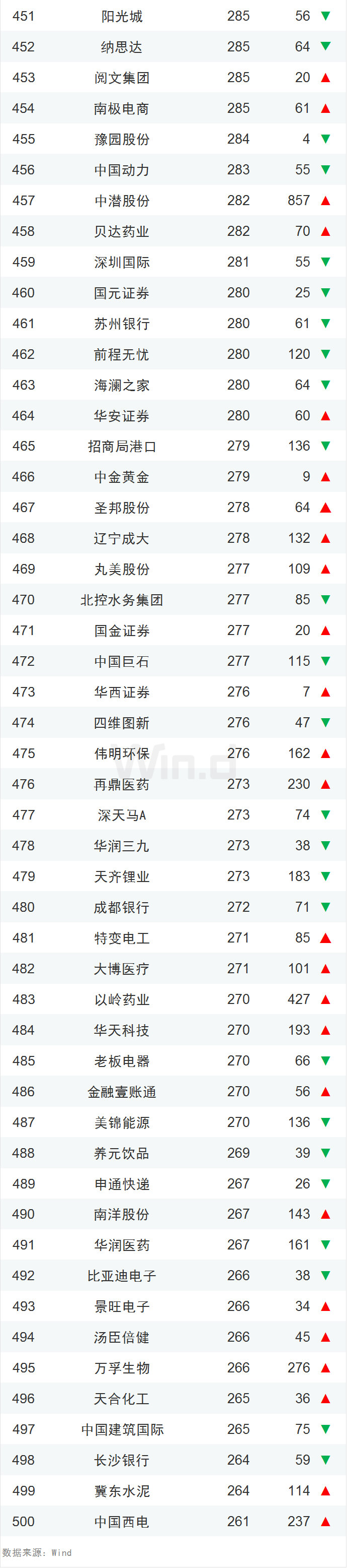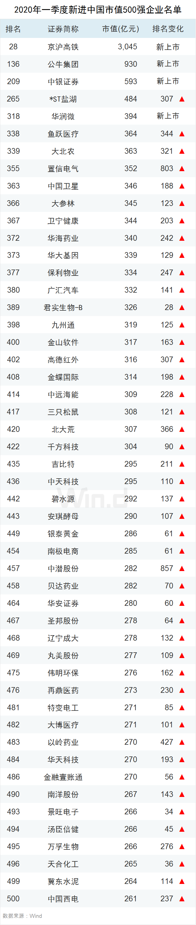 有50家新面孔跻身500强,其中多数因股价上涨市值攀升,亦有部分新上市企业。