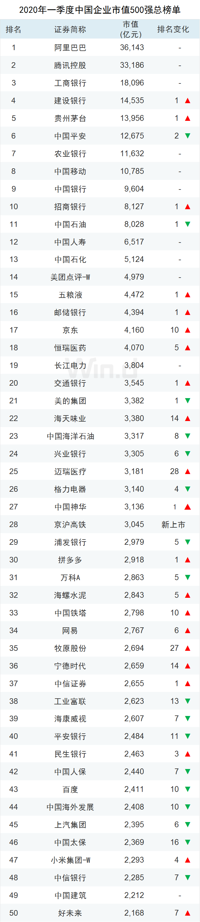 Wind最新发布2020年一季度“中国上市企业市值500强”榜单显示,阿里巴巴、腾讯控股市值稳居前两位,龙头地位进一步巩固,相比第三名工商银行的领先优势继续保持。