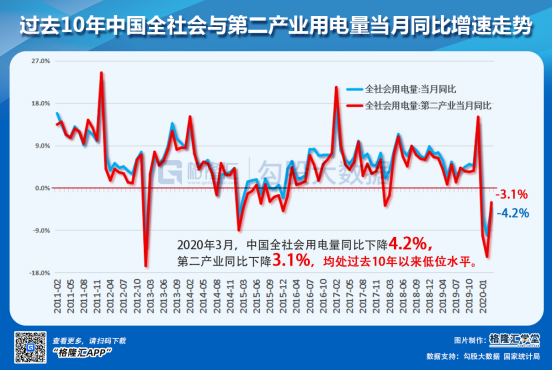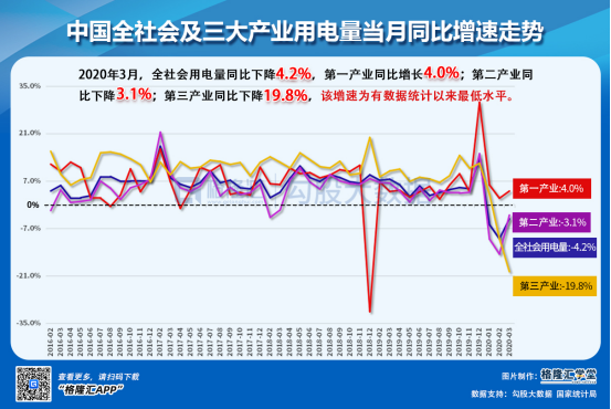 三月份,一产用电量正增长4个点、二产用电量增速也顽强拐头,低单位数负增长,唯有第三产业,继续大跳水,用电量同比负增长19.8%,为有数据统计以来的最低水平: