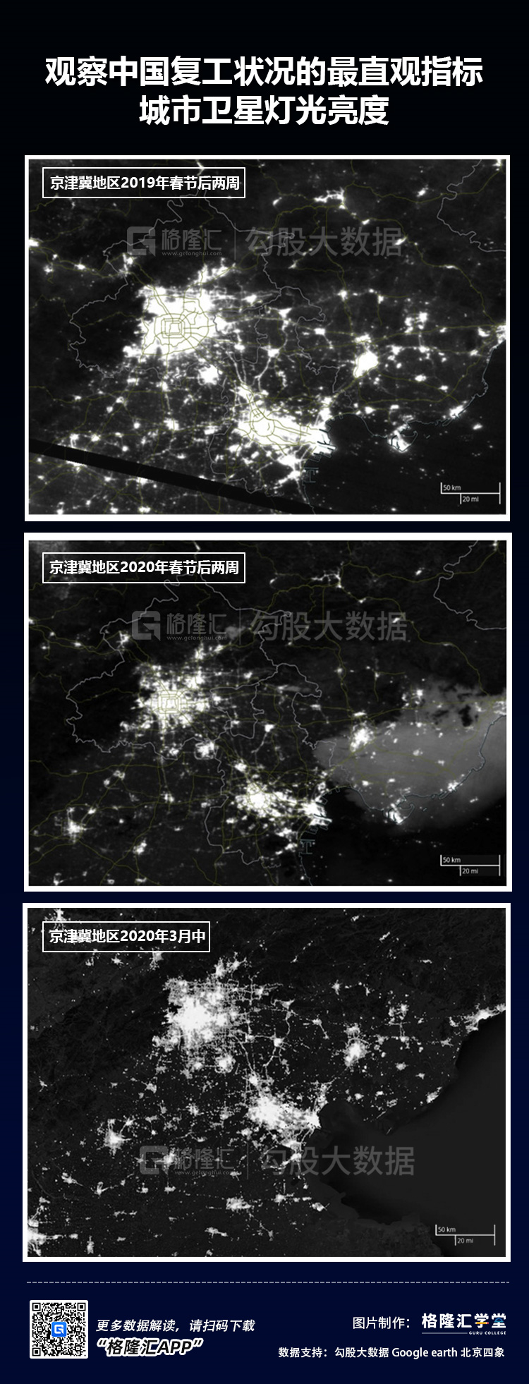 从Google地图上不难发现,疫情冲击下,2020年春节前后京津冀地区的灯光,大概只有2019年春节同期亮度的2-3成。而到了3月份,灯光基本恢复到了2019年正常水平的4-5成的水平: