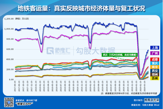 好在,我们有第二个维度,中国核心城市的地铁客运量。以疫情前的客运量为Benchmark,对比疫情后数据恢复情况,用以反映城市的经济恢复程度,完全符合统计学的严谨与逻辑。